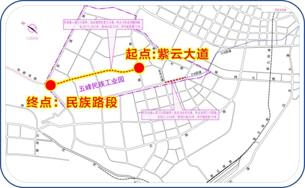 该项目位于宜昌五峰民族工业园,路线起于已建的紫云大道,止于规划民族路(接张家湾路),长2872m,红线宽度36m,设计速度50km/h。项目总投资2.0亿元,建设业主为宜昌建投集团所属城投公司,计划年内开工建设。